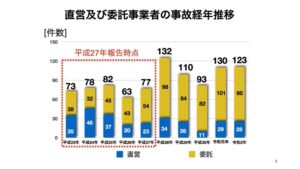 2016年8月27日に、集積所のごみ収集作業中にごみ収集車が無人の状態で約9メートル自走した結果、集積所ブロックに衝突、さらに後方駐車場に停車していた軽自動車に衝突するという事故が宮前区菅生ヶ丘で発生したことをきっかけに、その年の議会で、官民の「安全」に対する意識の違い事故件数・率の調査結果を具体的に示し、改善の必要性を訴えたことが、すべてのきっかけです。