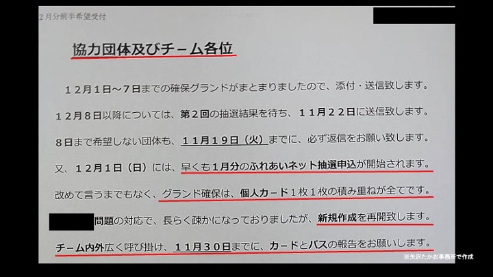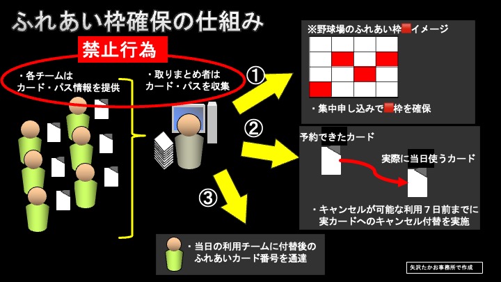 しかし、(ディスプレイ3〜7)昨年も紹介したとおり、ふれあいカードを組織的に収集していることが判明している中、収集したカードを使って大量に予約抽選に申し込み、予約を独占する、といった不正が現状でも続いていると考えます。これまで、野球場利用における「ふれあいネット枠」は不正の温床となっていることを指摘し続けてきましたが、実態の把握は進んでいるのか伺います。