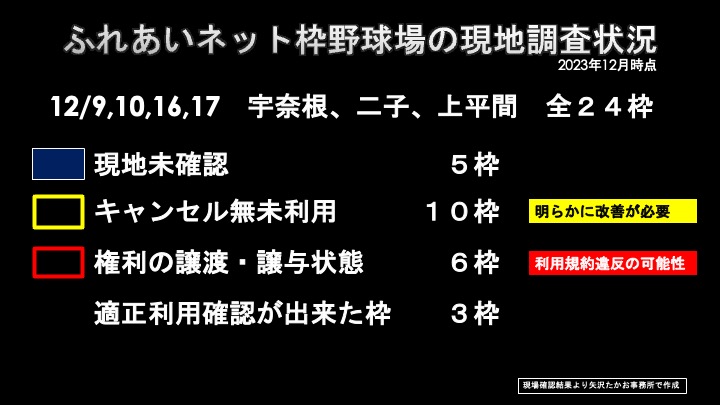 (意見要望)今回の質疑で、多摩川河川敷野球場施設における不正利用はふれあいネット枠を除いた8〜9割の枠において、すべてがふれあいネット枠だった当時と比べて、又貸しや未キャンセル未利用といった不適切利用の是正が進んでおり、2年間で劇的に改善されたことが確認できました。一重に担当職員皆様、志同じく不適切利用・不正利用の是正に向けた取組にご協力頂いている多くの野球団体・関係者皆様のお陰だと感じております。