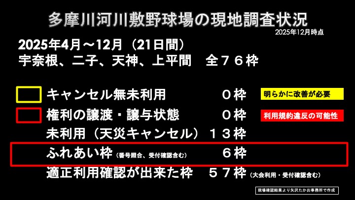・多摩川河川敷野球場施設における不適切・不正利用はふれあいネット枠を除く8〜9割で劇的に改善されている。